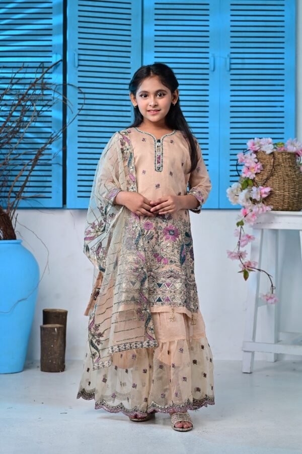 Adorable *Sharara Kameez set* for babies, designed with soft fabric and beautiful *embroidery work* on the kameez. Comes with a matching *dupatta featuring elegant detailing*, giving a festive yet comfy look.