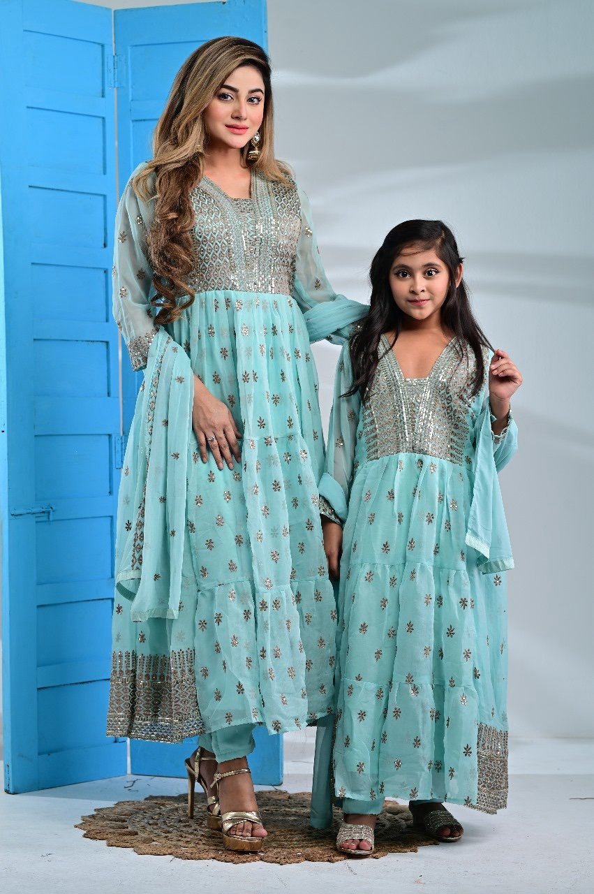 Celebrate your special moments with our stunning Big & Baby Combo Gown Set – crafted from premium Indian fabric with beautiful embroidery and zari work.