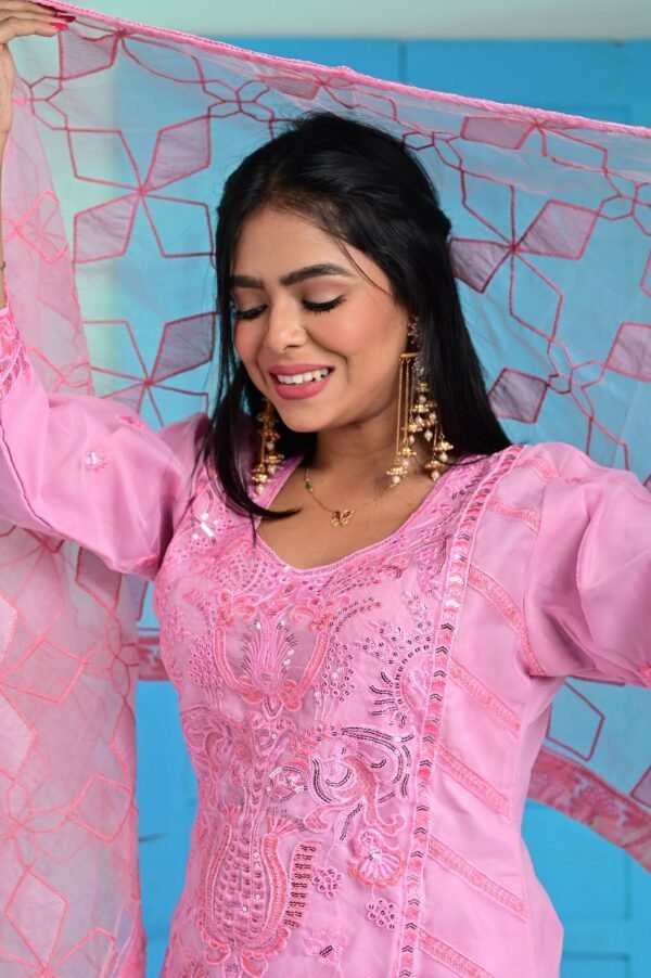 Step into elegance with this beautifully crafted kameez set, made from soft and high-quality *Chundri Indian fabric*. The kameez features *fine embroidery and traditional karcupi (zari) handwork* on the neckline, sleeves, and front body.